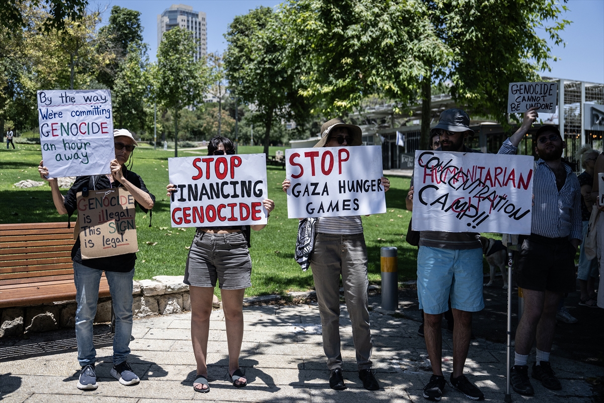 İsrailli sol eğilimli grup "Free Jerusalem" (Özgür Kudüs) hareketi aktivistleri tarafından düzenlenen eylemde, her gün yardım beklerken onlarca Filistinlinin merkezlerinde hayatını kaybettiği GHF ve İsrail'in Gazze Şeridi'nin güneyindeki Refah'ta "insani kent" adı altında kurmak istediği "toplama kampları" protesto edildi.