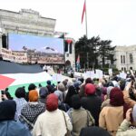 Etkinlikte, ana kapı önünde İsrail'in Gazze'deki yıkımının arşiv görüntülerinin yayınlandığı dev bir ekran kuruldu.