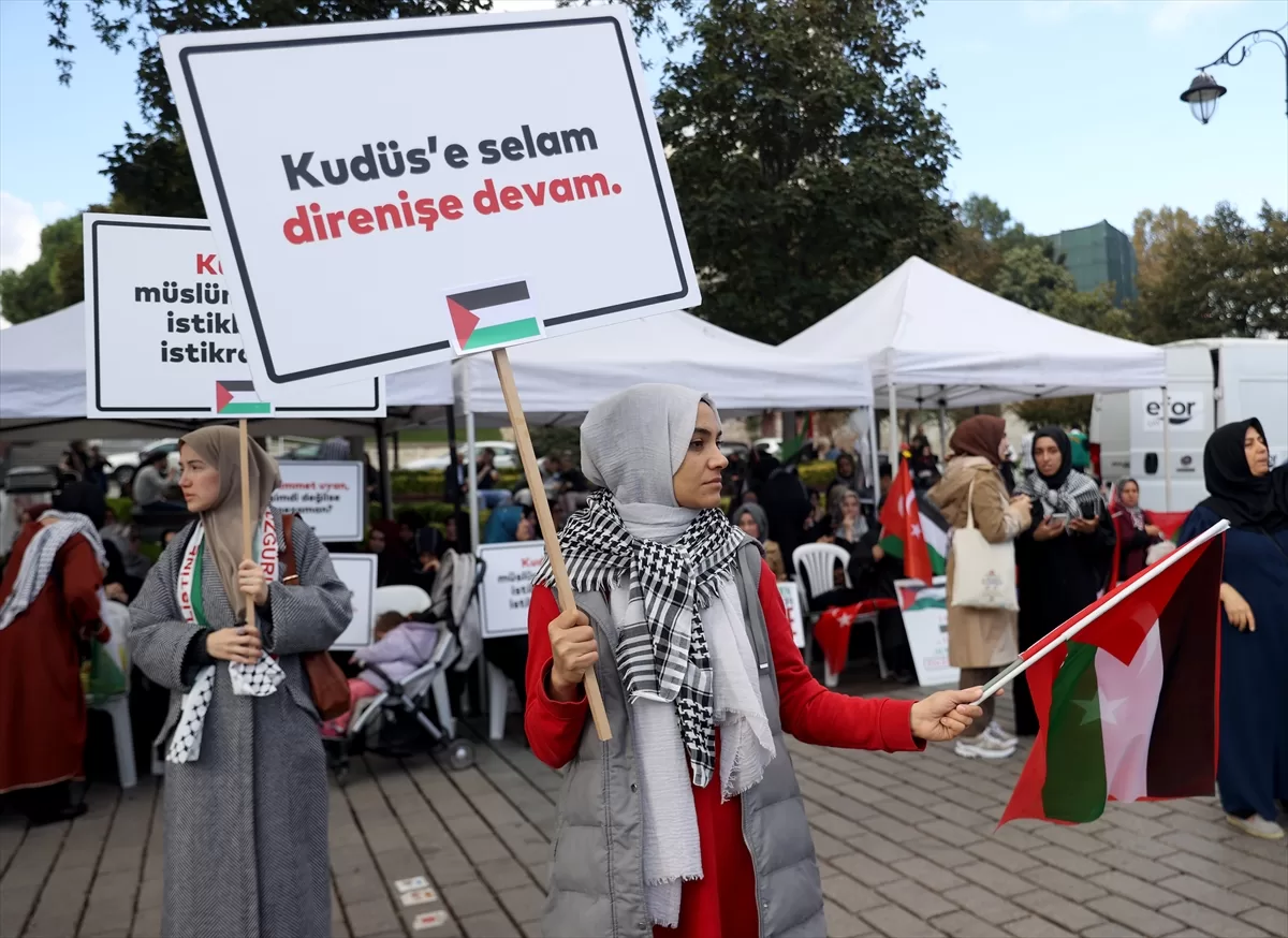 Toplam 74 farklı sivil toplum kuruluşunun destek verdiği etkinlikte gönüllü kadınlar, ellerinde Türk ve Filistin bayraklarıyla İsrail'e tepkilerini göstermek için bugün de bir araya geldi.
