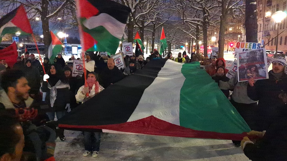 STOCKHOLM (AA) – İsveç'in başkenti Stockholm'deki İsrail Büyükelçiliği önünde toplanan bir grup, İsrail'in Gazze'ye yönelik saldırılarını protesto etti.