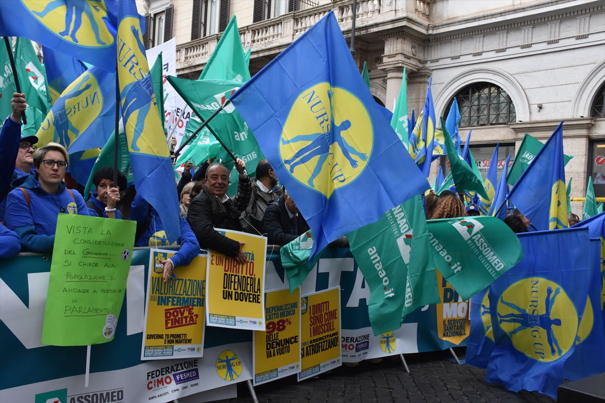 Hastanelerde sağlık personeline daha fazla saygı gösterilmesini talep eden gruptakiler, İtalyanca "saygı" yazılı dövizler taşıdı. Katılımcılar, kaynak yetersizliğine de tepki gösterdi.