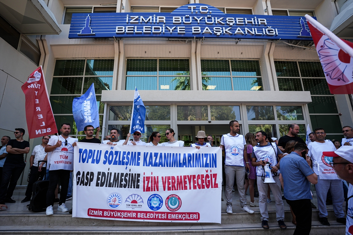 İZMİR (AA) – İzmir Büyükşehir Belediyesi ile Tüm Belediye ve Yerel Yönetim Hizmetleri Emekçileri Sendikası (Tüm Bel-Sen) arasındaki sosyal denge tazminatını içeren toplu iş sözleşmesi görüşmelerinde uzlaşma sağlanamaması üzerine daha önce 2 gün iş bırakan memurlar, bugün de eylemlerini sürdürdü.