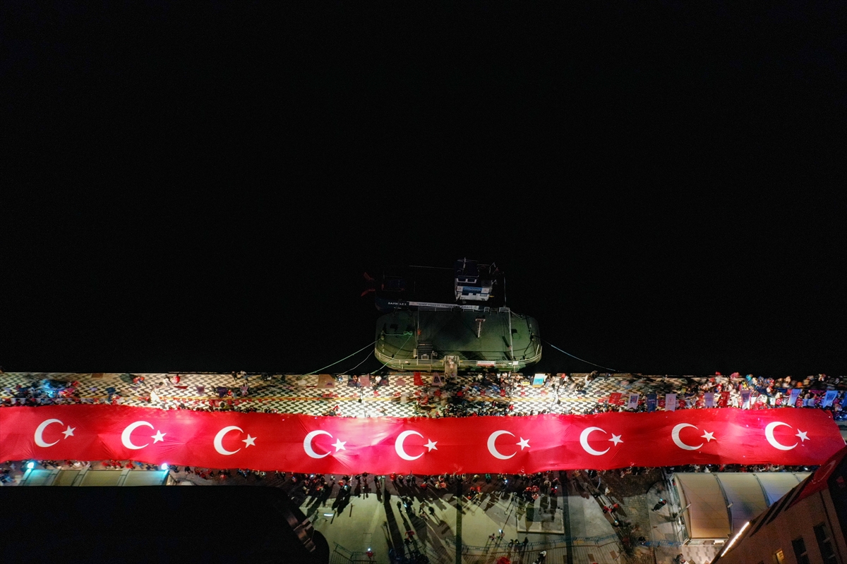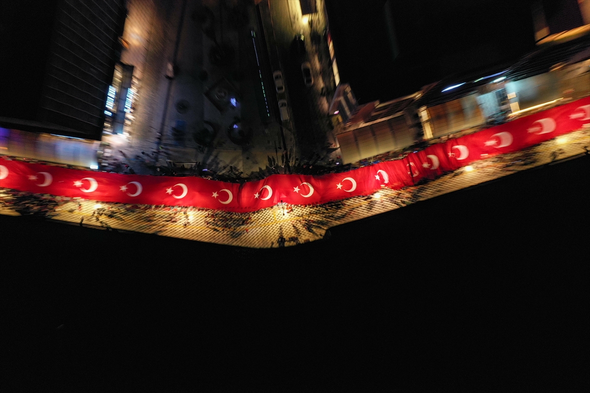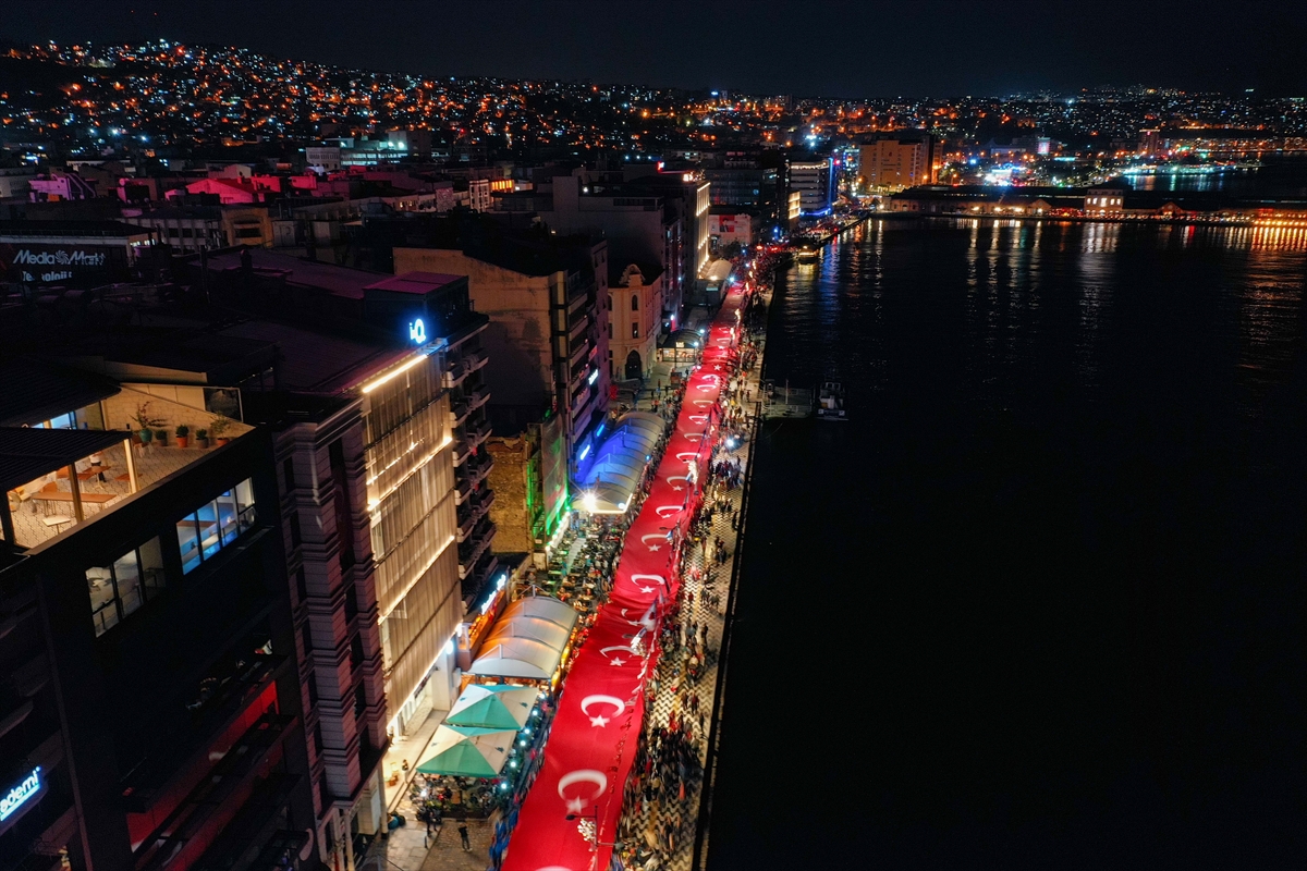 İzmir Valiliği tarafından Cumhuriyet Bayramı kutlamaları kapsamında Konak Meydanı'nda açılan 350 metrelik Türk bayrağı ile Cumhuriyet Meydanı'na yürüyüş ve fener alayı düzenlendi.