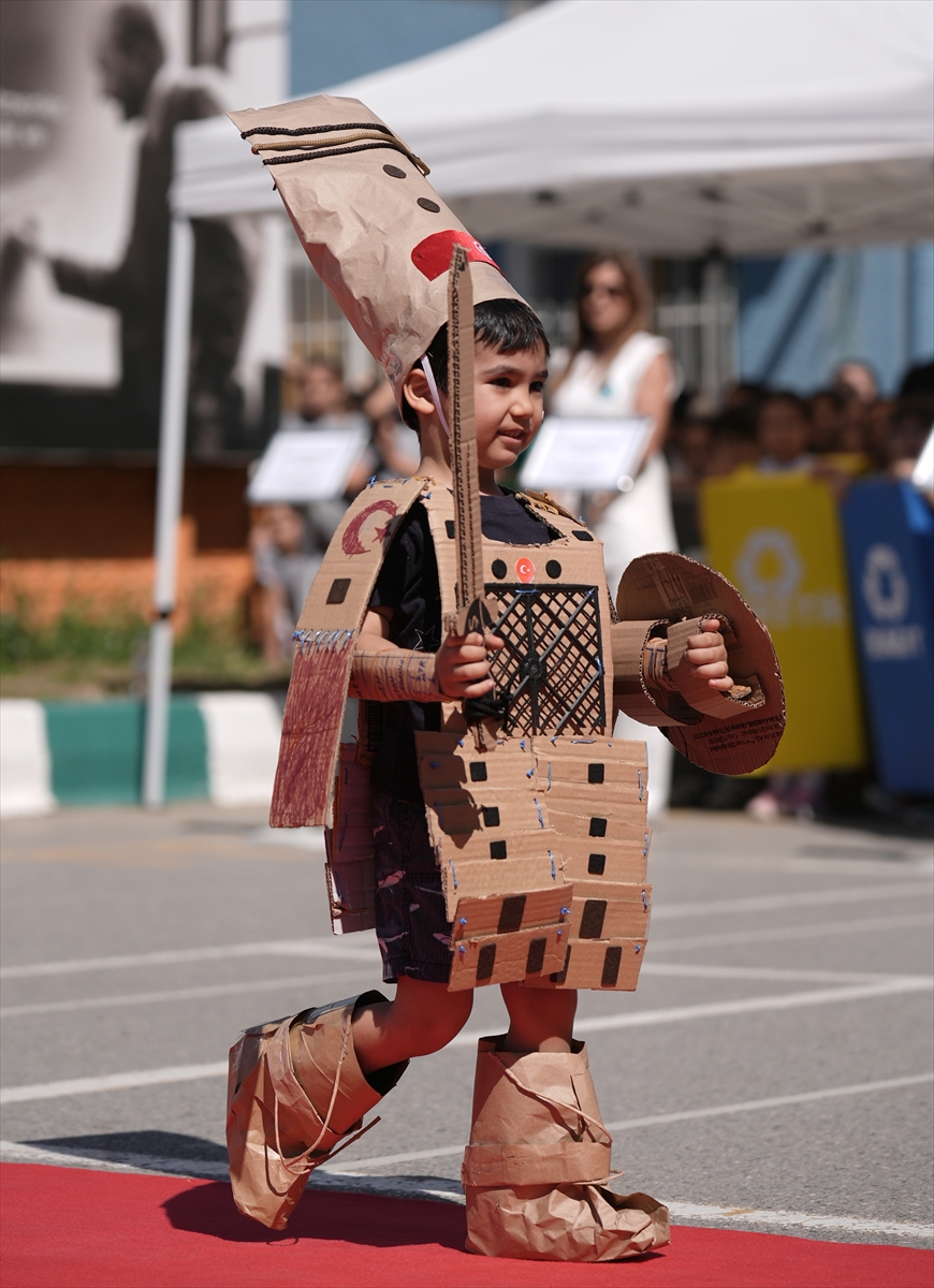 Bornova Fatih Sultan Mehmet İlkokulu'nda gerçekleştirilen defilede, öğrenciler öğretmen ve velilerin desteğiyle yaptıkları kıyafetleri giydi.