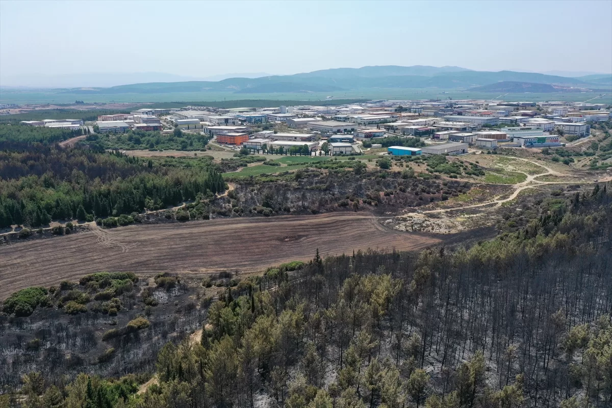 Havadan çekilen görüntülerde, yangının Menderes İTOB Organize Sanayi Bölgesi'nin yakınında durdurulduğu görüldü.