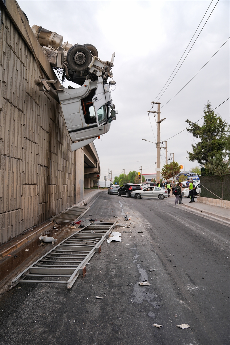 İrfan Öngen (48) idaresindeki 06 FGT 332 plakalı tır, Ankara Caddesi 4. Sanayi Kavşağı'nda seyir halindeyken sürücüsünün kontrolünü kaybetmesi sonucu devrildi. Sürüklenen tır, viyadükte asılı kaldı.