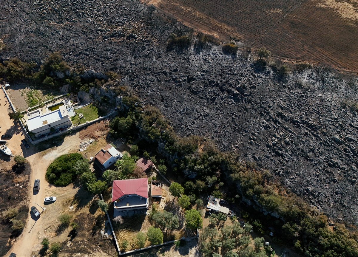 Ormanlık alanın alevler nedeniyle siyaha bürünmesi ve yangında hasar alan tarım arazileri dronla görüntülendi.