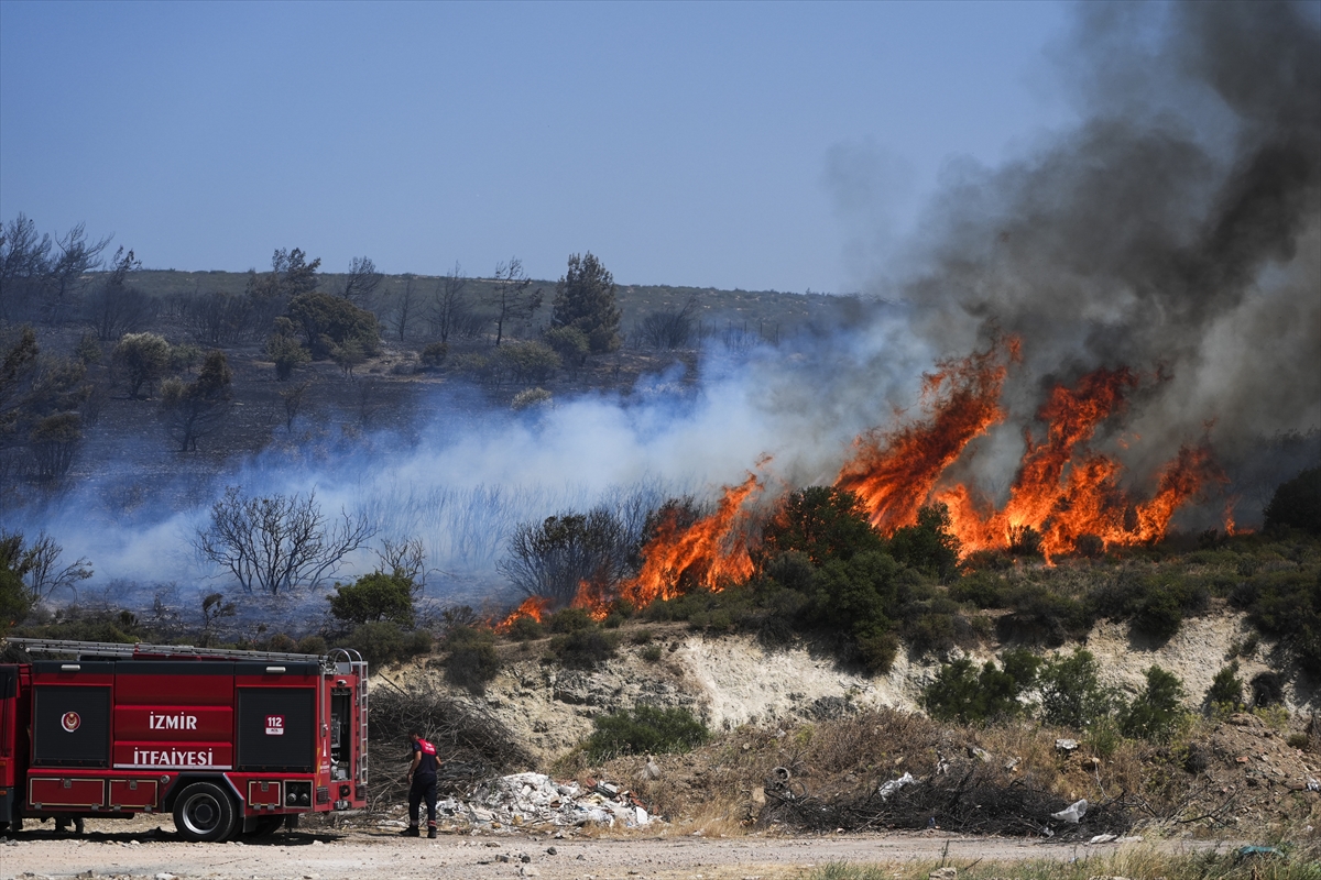 İhbar üzerine bölgeye İzmir Orman Bölge Müdürlüğüne ait 4 uçak, 6 helikopter, 25 arazöz, 7 su ikmal aracı ve 4 dozer sevk edildi.