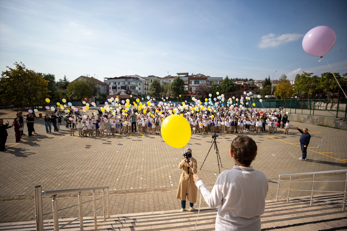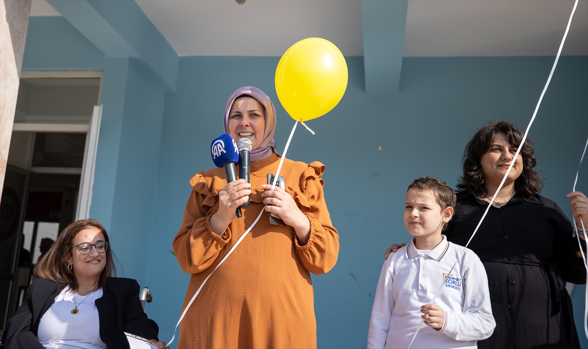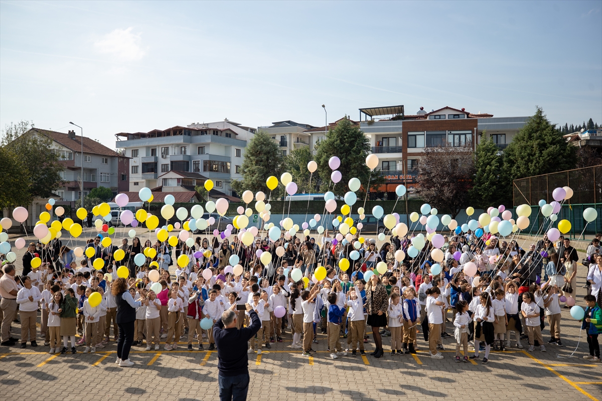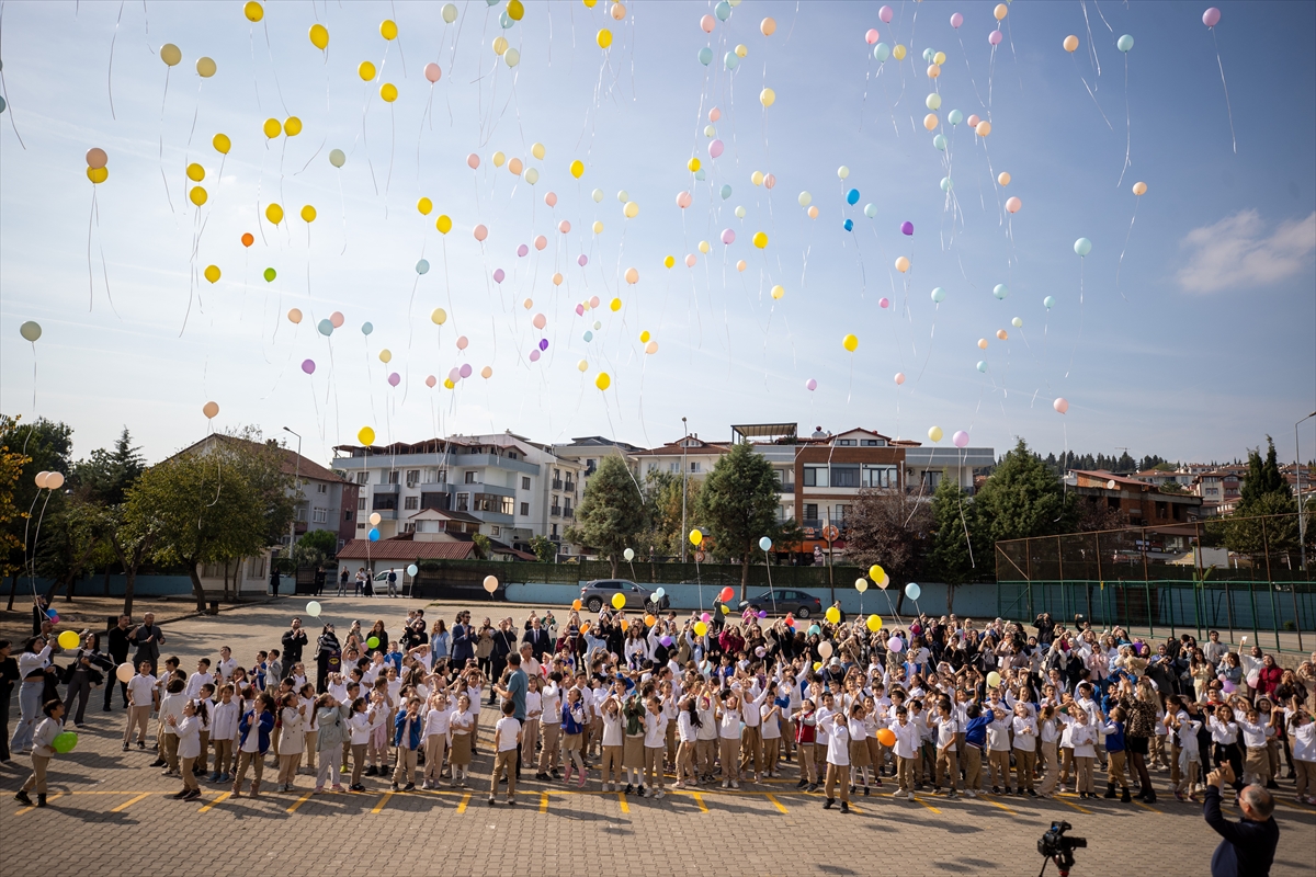 Karataş'ın eğitim gördüğü Mehmet Zorlu İlkokulu öğrencileri, ellerindeki rengarenk balonları küçük kızın geri sayımıyla gökyüzüne bıraktı.