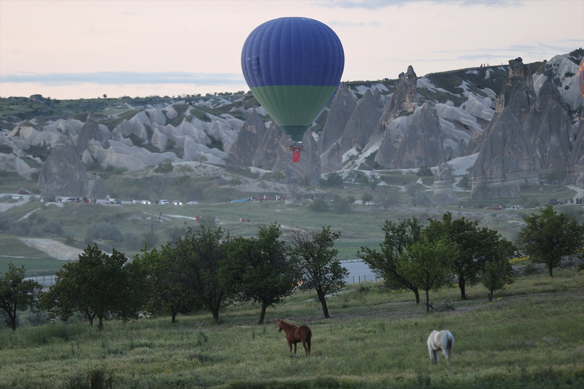 Tura katılan turistlerin sepetlere alınmasının ardından sıcak hava balonları bölge semalarına yükseldi.