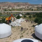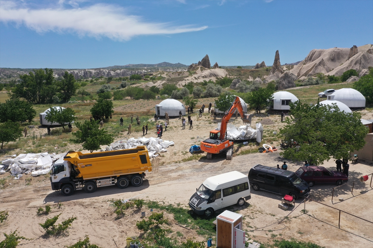 NEVŞEHİR (AA) – Kapadokya'da, peribacası oluşumlarının yakınına kaçak inşa edilen 11'i iglo mimarisiyle yapılmış 13 bölümün bulunduğu konaklama tesisi yıkıldı.