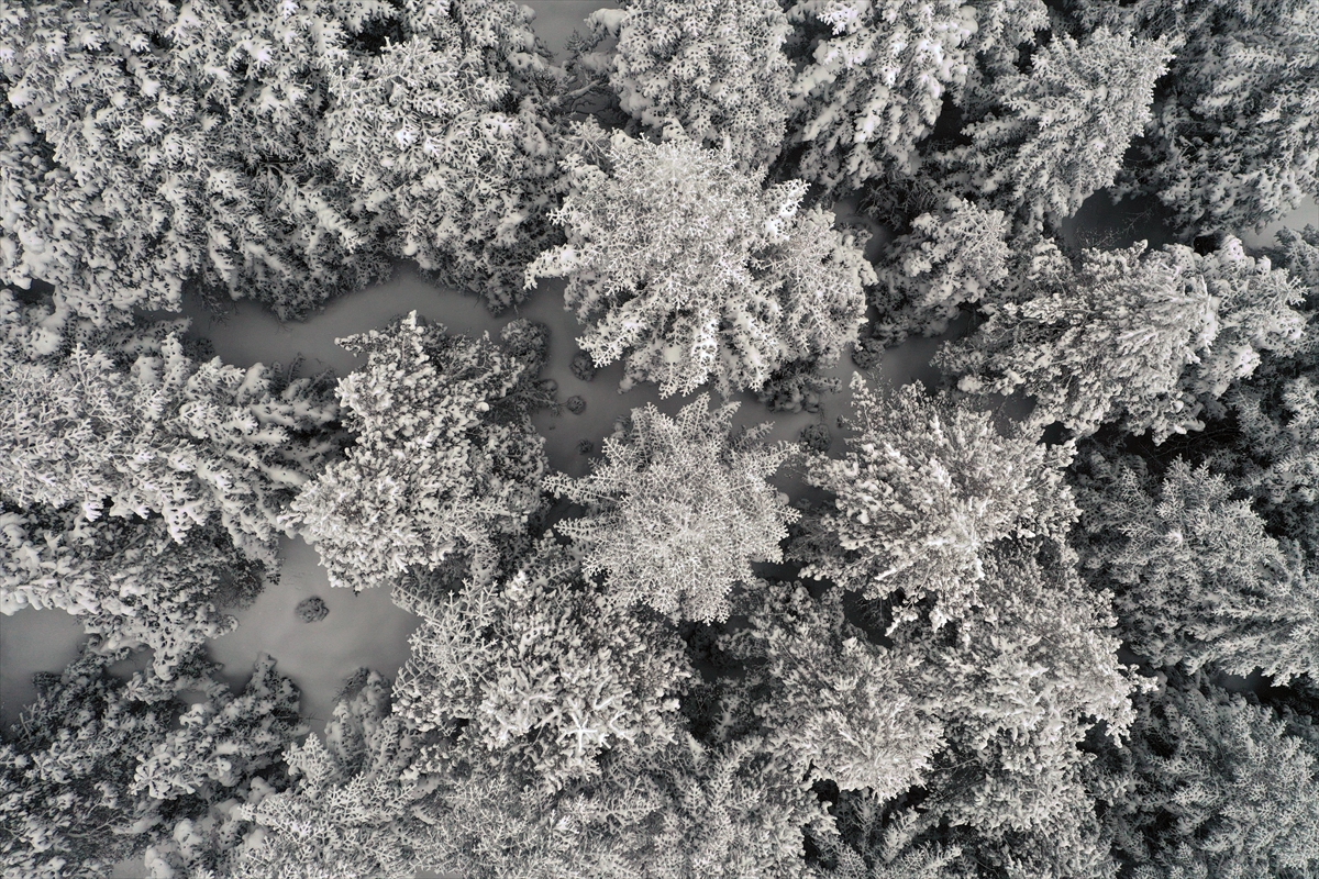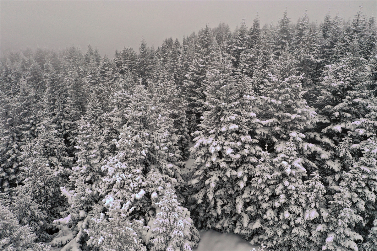 Ormanlık alanların karla buluşması, AA muhabiri tarafından dronla görüntülendi.