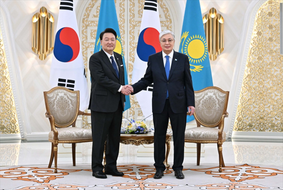 Kazakistan Cumhurbaşkanı Kasım Cömert Tokayev, resmi ziyaret gerçekleştirmek üzere ülkeye gelen Güney Kore Devlet Başkanı Yoon Suk Yeol'ü Cumhurbaşkanlığı Sarayı Akorda'da törenle karşıladı.