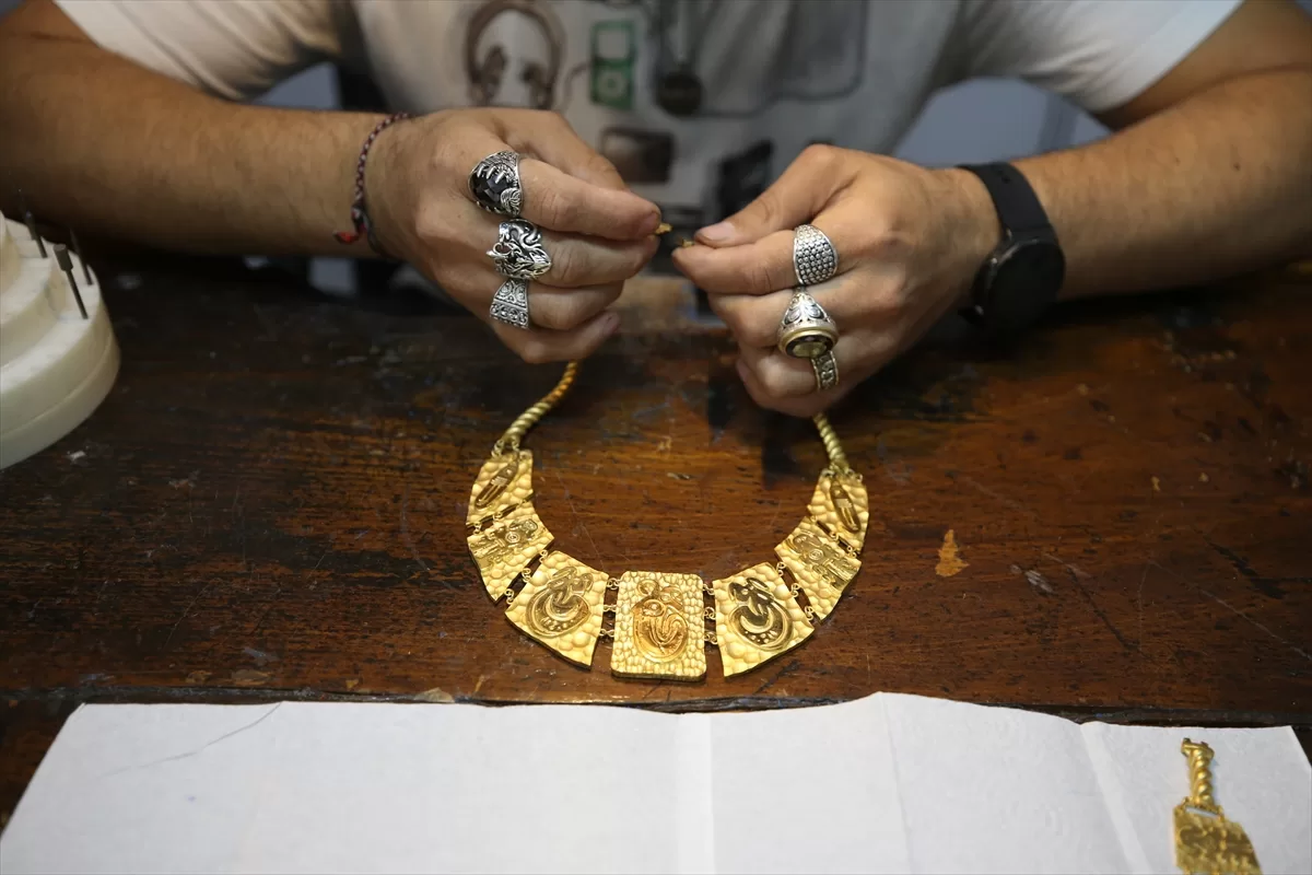 DİYARBAKIR (AA) – AHMET KAPLAN – Diyarbakır'ın Bismil ilçesinde yaklaşık 12 bin 500 yıllık Körtik Tepe'deki kazılarda çıkarılan eserlerdeki farklı hayvan figürleri takı tasarım ustası tarafından altın gerdanlık, küpe, yüzük ve bileklikte kullanıldı.