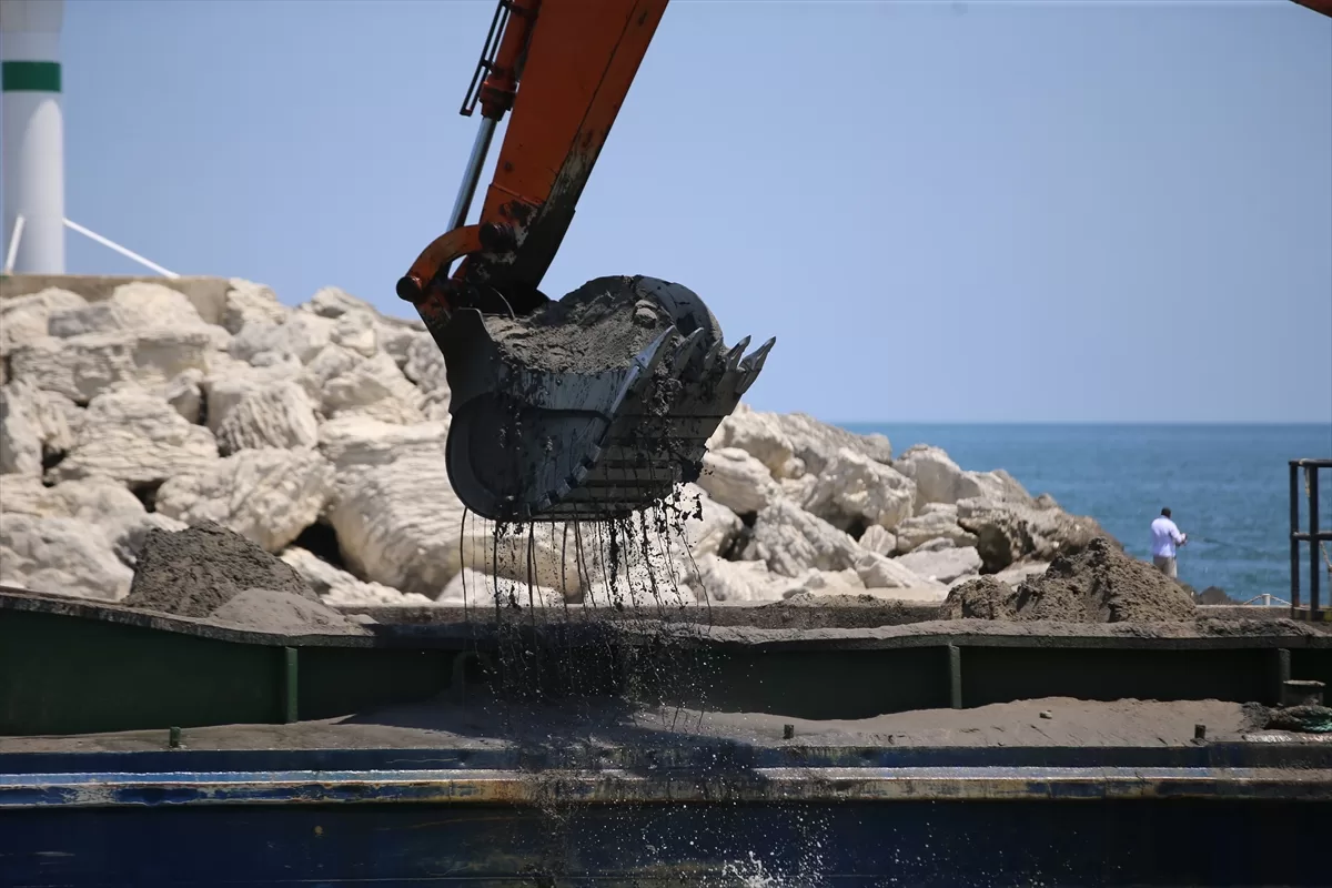 Yaklaşık bir ay önce başlatılan çalışmalar kapsamında kumlar liman dışına çıkarılıp İl Özel İdaresi ekiplerince bölgeden götürülüyor.