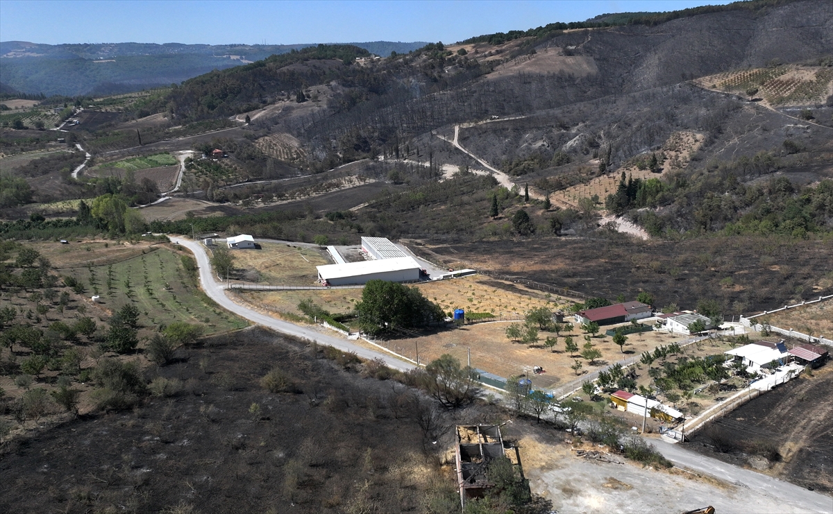 Yangında zarar gören ormanlık alanlar ve tarım arazileri dronla görüntülendi.