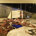 Tırın dorsesinde bulunan domatesler yola saçıldı, alt geçit bir süre trafiğe kapatıldı.
