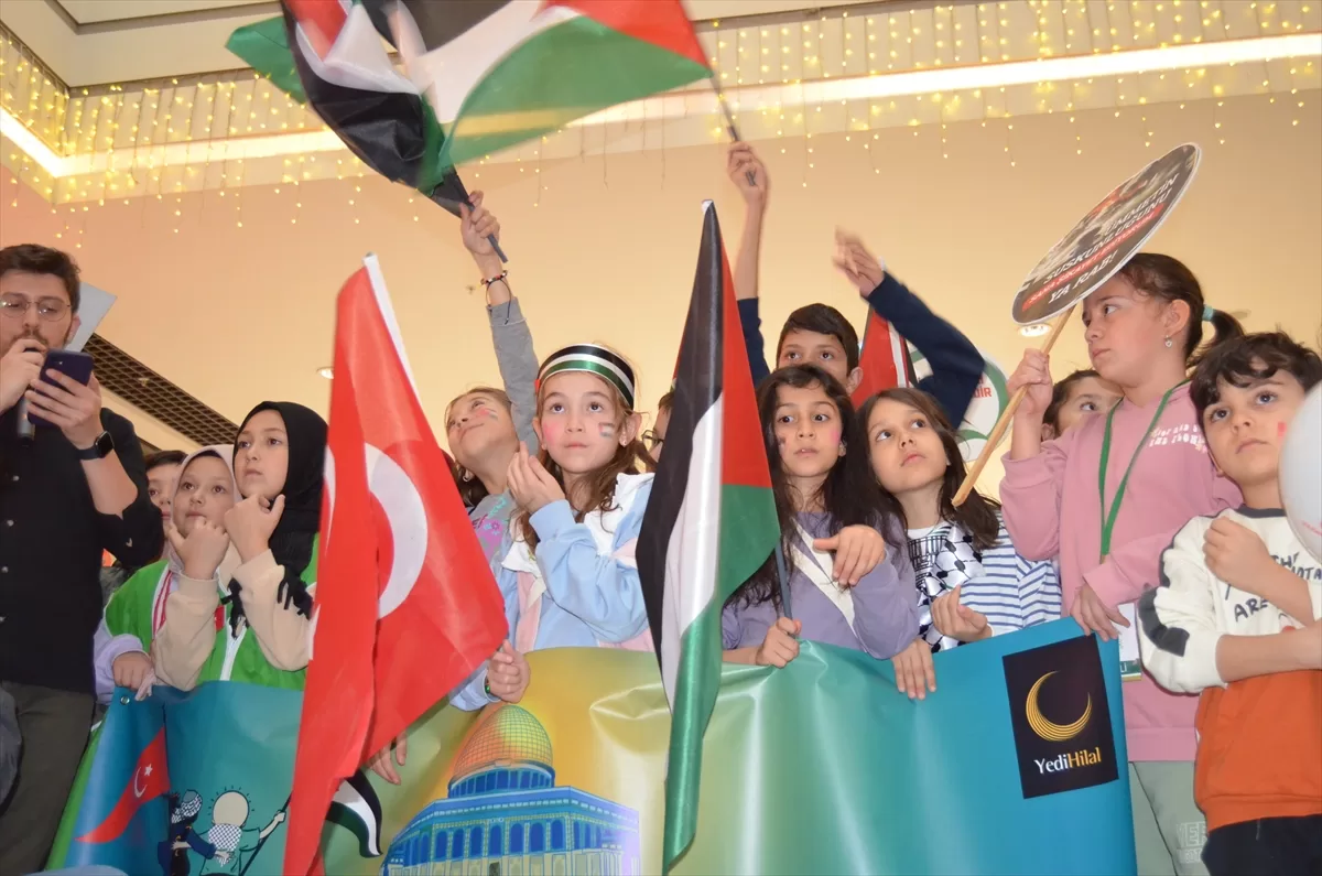 Ellerinde Türk ve Filistin bayrakları, balonlar ve "Özgür Filistin", "Filistin halkı yalnız değildir" yazılı dövizler taşıyan çocuklar AVM içinde yürüdü.