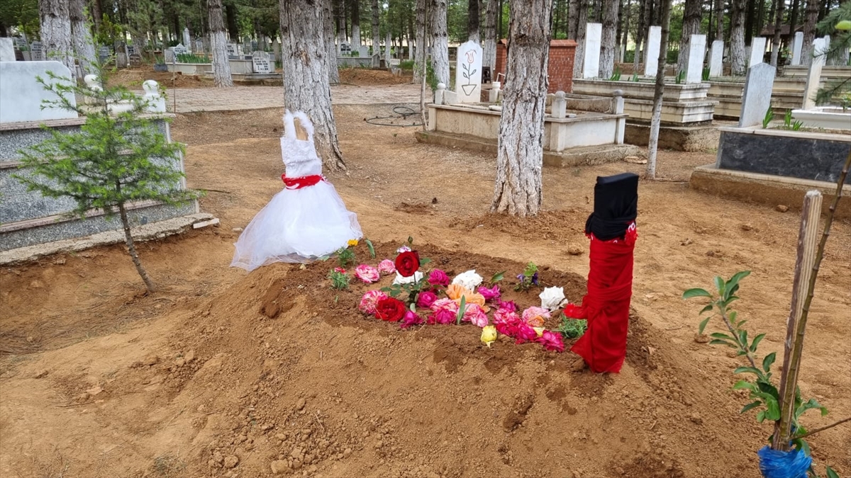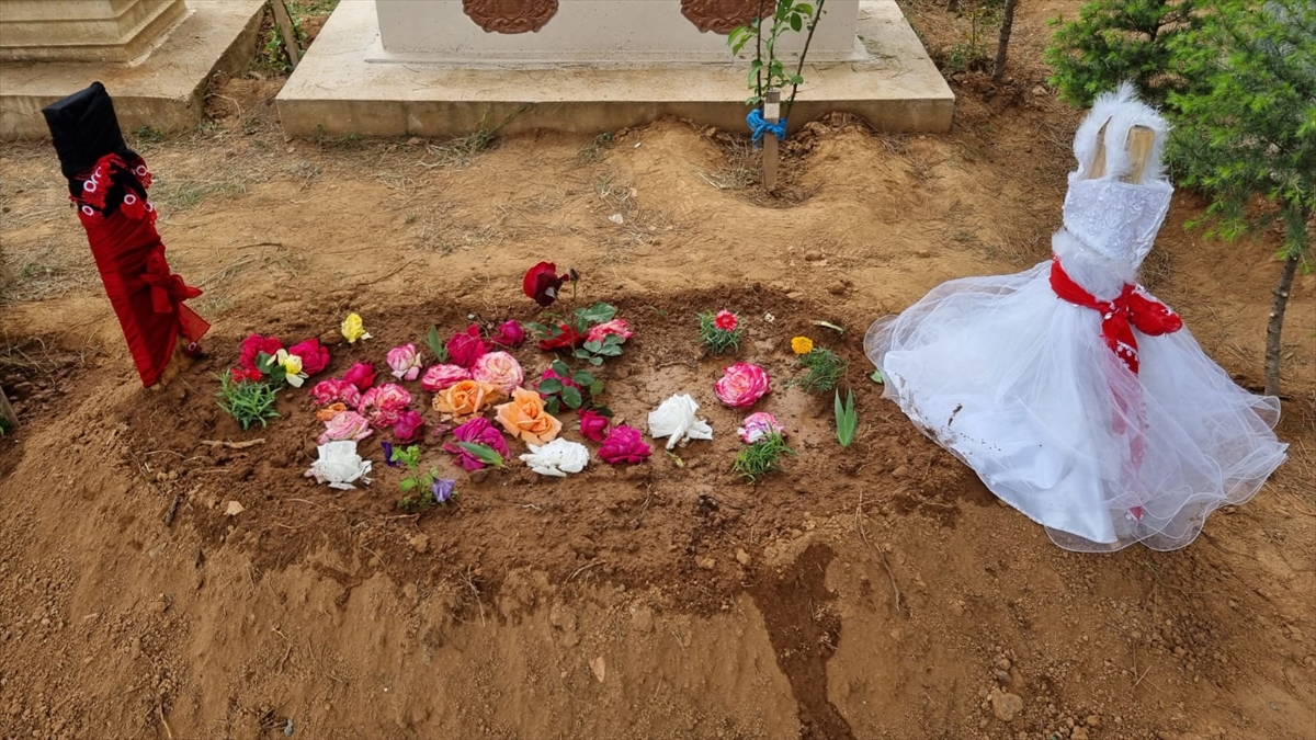 Küçük çocuğun mezarının başına, al yazmaya sarılı gelinlik konuldu.