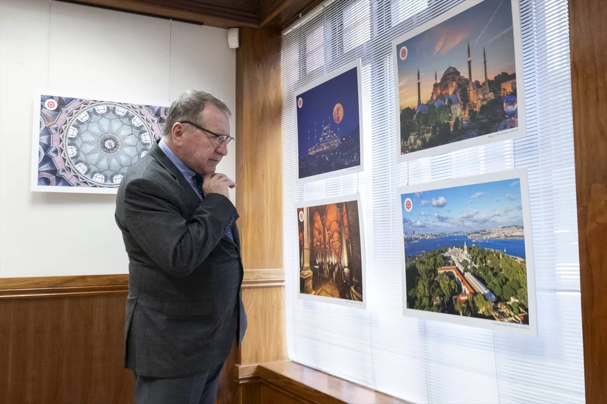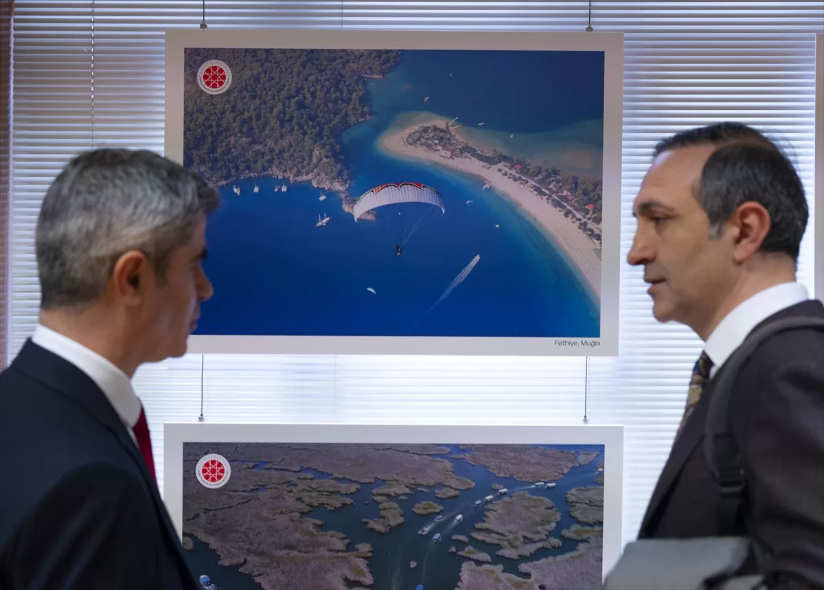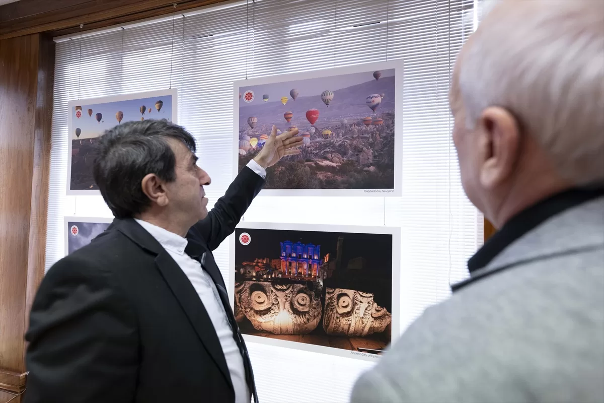 Ege sahilleri, antik kentler, tarihi yapılar ve manzaraların yer aldığı 40 kareden oluşan sergiyi gezen Ertaş, fotoğraflarla ilgili bilgi aldı.