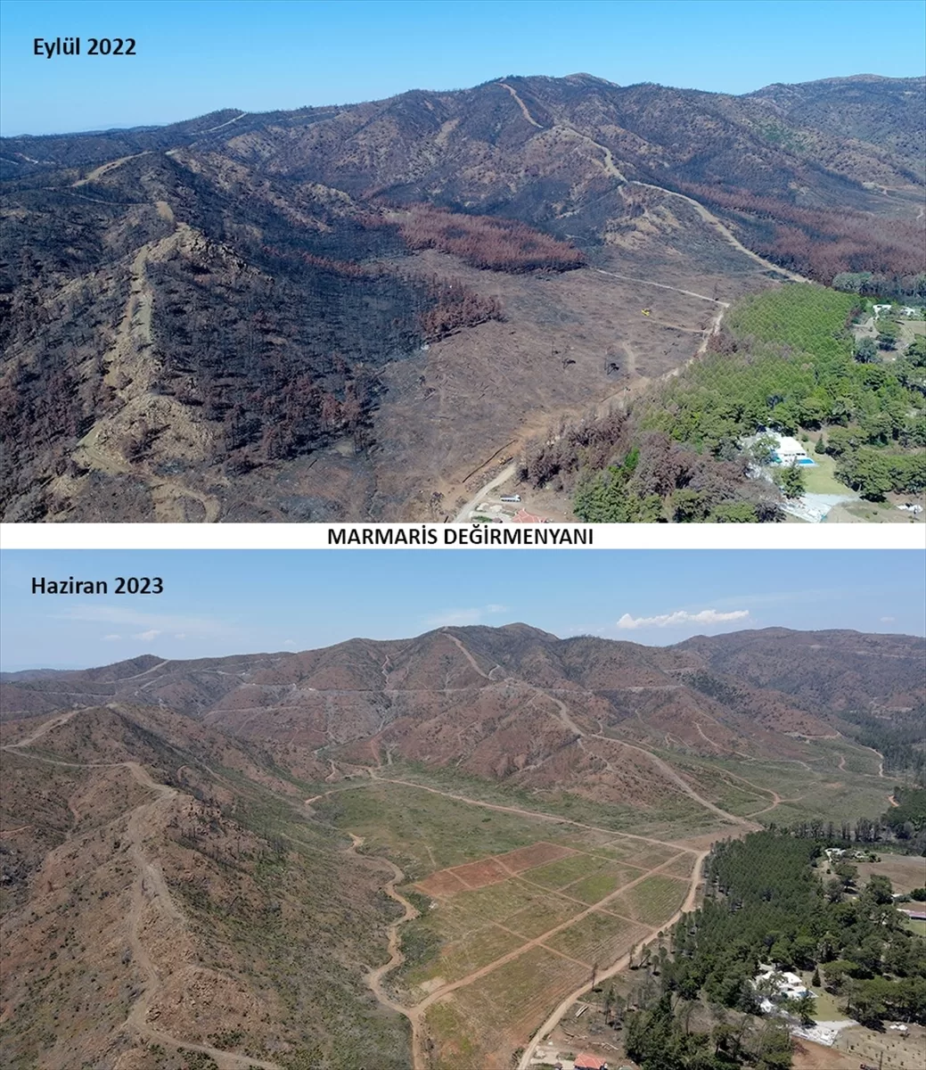MUĞLA (AA) – Muğla'nın Marmaris ilçesinde, 21 Haziran 2022'de başlayan ve ekiplerin yoğun müdahaleleri sonucu söndürülen orman yangını sırasında Bördübet'te zarar gören alanlar, tekrar yeşermeye başladı.