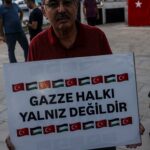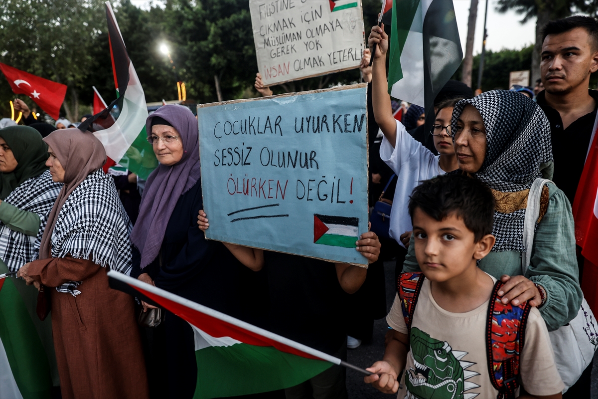 Katılımcılar, ellerindeki Türk ve Filistin bayrakları ile "Soykırıma hayır", "Özgür Filistin" ve "Gazze halkı yalnız değildir" yazılı pankartlar taşıyarak, slogan attı.