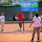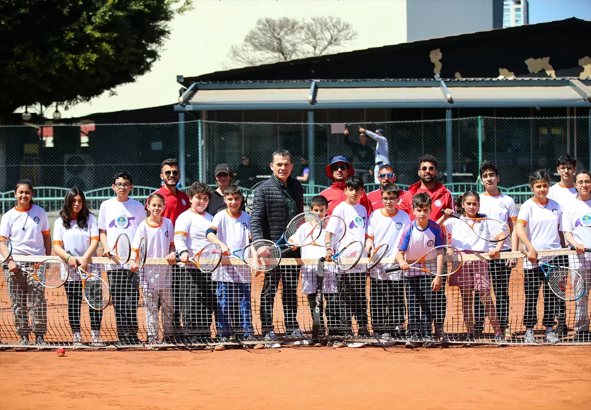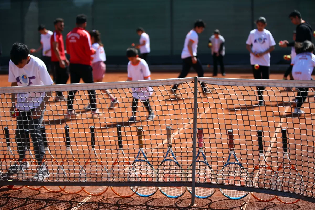 Spor kıyafeti ve malzemeleri temin edilen çocuklar, antrenörler eşliğinde tenis öğrenmeye başladı.