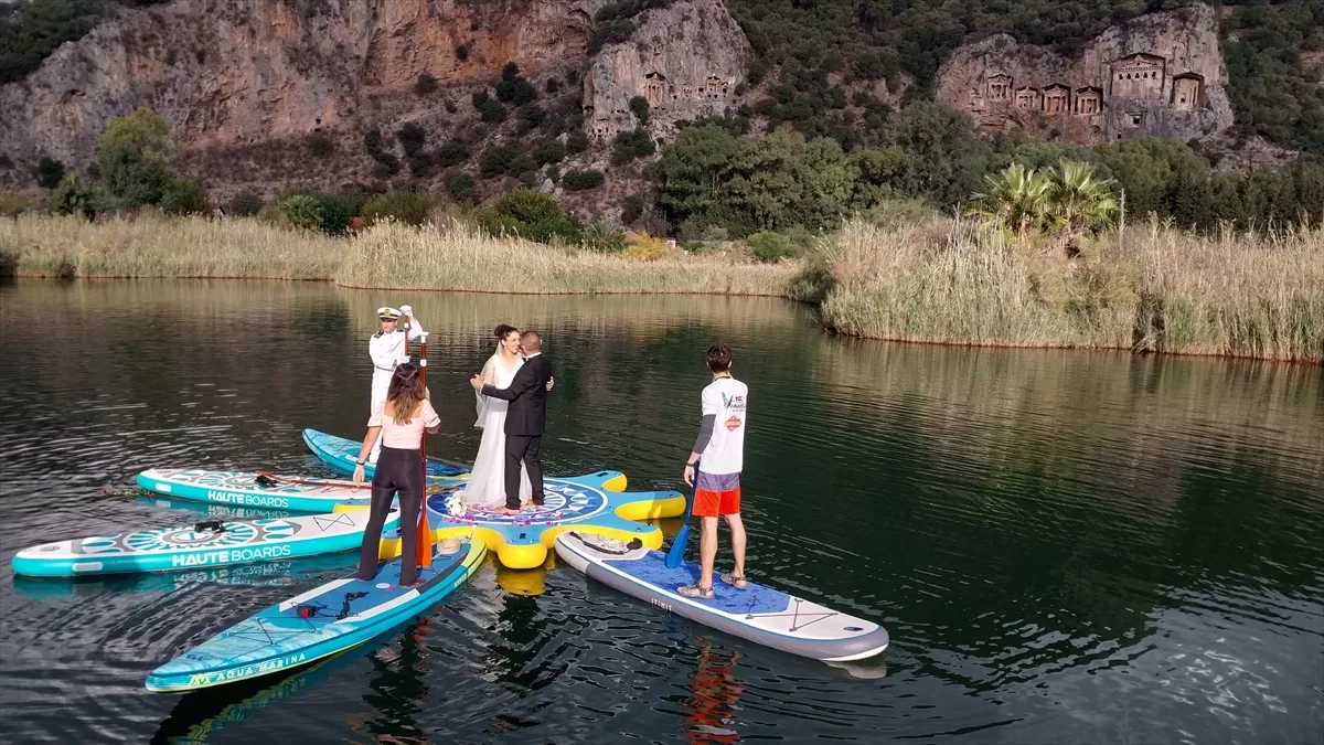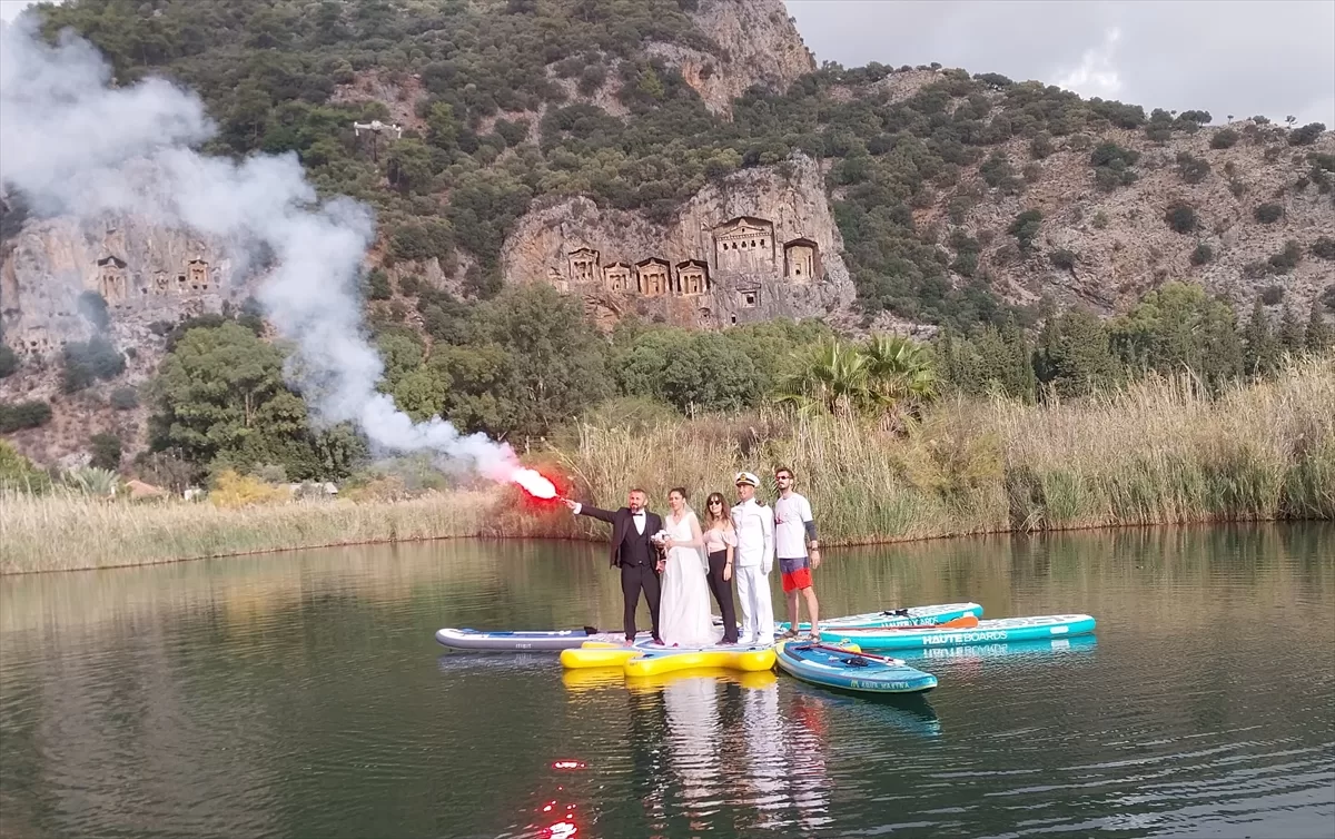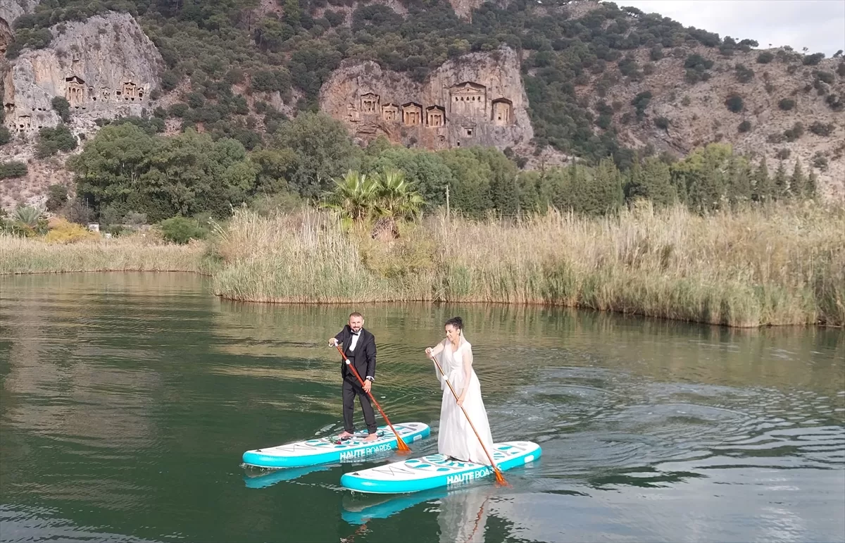 Gelinlik ve damatlıklarıyla deniz kayağına binen çift ve arkadaşları kanolarla Köyceğiz gölü ve Ortaca Dalyan Kanalı'nda sazlıkların arasında yaklaşık 2 kilometre kürek çekerek nikah töreni için hazırlanan Kaya Mezarları'nın önüne ulaştı.