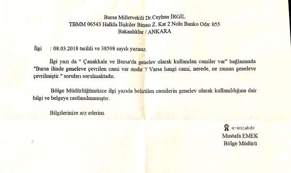 CHP Bursa Milletvekili Ceyhun İrgil, Yrd. Doç. Dr. Abdullah Akın’ın ‘Çanakkale ve Bursa’da genelev olarak kullanılan camiler var’ iddiası üzerine ‘Bilgi Edinme Hakkı Kanunu’ çerçevesinde Bursa Valiliği’ne yazılı olarak “Bursa ilinde geneleve çevrilen cami var mıdır? Varsa hangi cami nerede, ne zaman geneleve çevrilmiştir?” sorularını yöneltti. CHP’li İrgil’in sorularına, Vakıflar Bölge Müdürü Mustafa Emek imzalı yazılı yanıt geldi. Emek, iddialara ilişkin “Camilerin genelev olarak kullanıldığına dair bilgi ve belgeye rastlanılmamıştır” dedi.