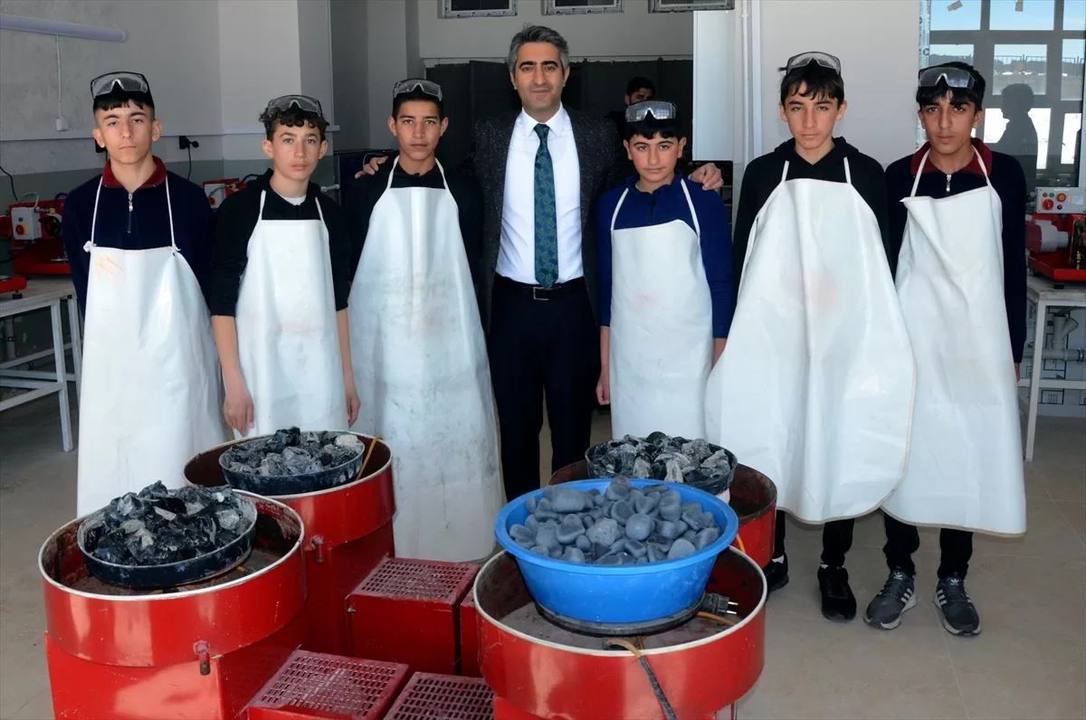 KARS (AA) – HÜSEYİN DEMİRCİ – Takı yapımının yanı sıra çeşitli sektörlerde kullanılan ve lavların hızla soğumasıyla oluşan volkanik cam obsidiyen, Kars'ın Sarıkamış ilçesinde meslek lisesi öğrencilerinin hünerli ellerinde takı ve çeşitli ürünlere dönüşüyor.