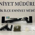Adrese düzenlenen operasyonda, çeşitli miktarlarda uyuşturucu, 1 ruhsatsız tabanca, 1 pompalı tüfek, 2 fişek ve 2 kartuş ele geçirildi.