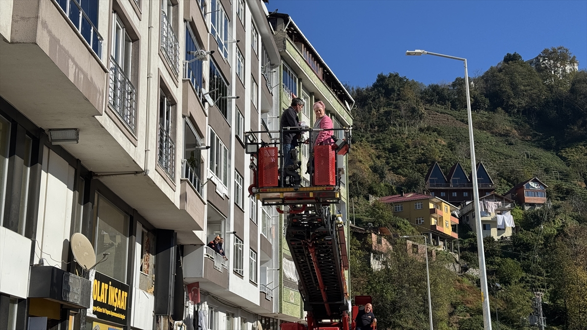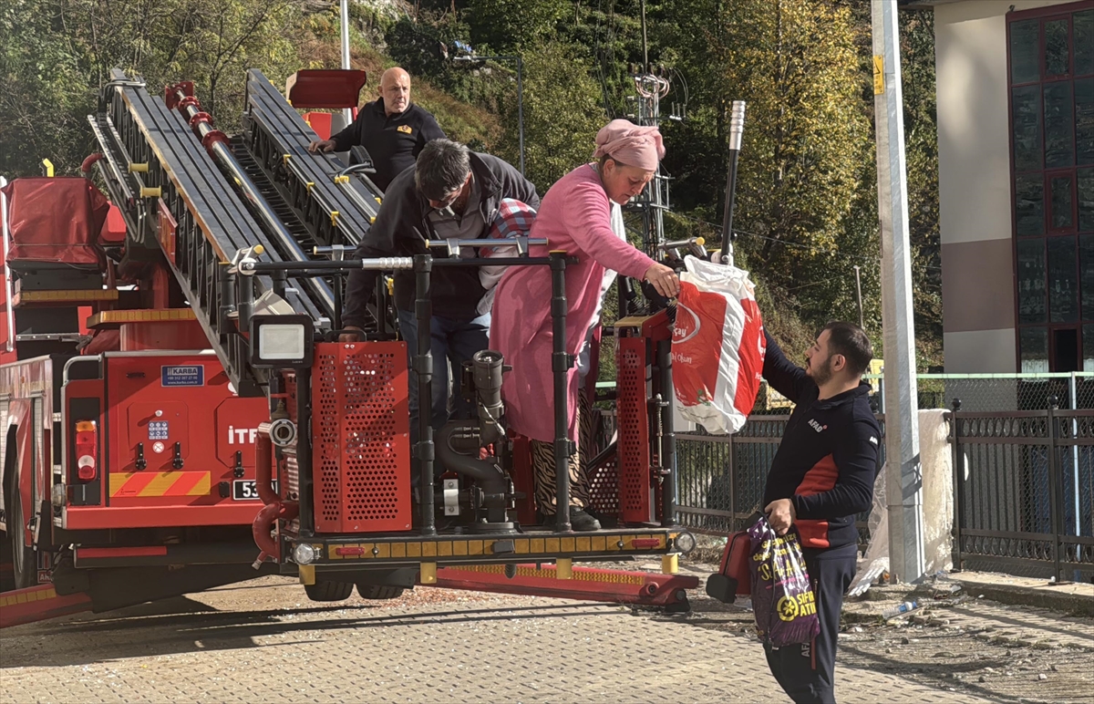 Heyelan riski nedeniyle konutlarından tahliye edilen bina sakinleri, AFAD ekiplerinin gözetiminde ihtiyaç duydukları eşyalarını Çayeli Belediyesi itfaiye aracı yardımıyla dışarı çıkarıyor.