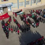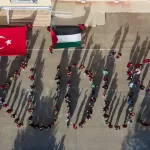 Türkiye ve Filistin bayrakları da açan 140 öğrenci, şair ve yazar Abdurrahim Karakoç'un "Aydınlık" şiirini koro halinde seslendirdi.