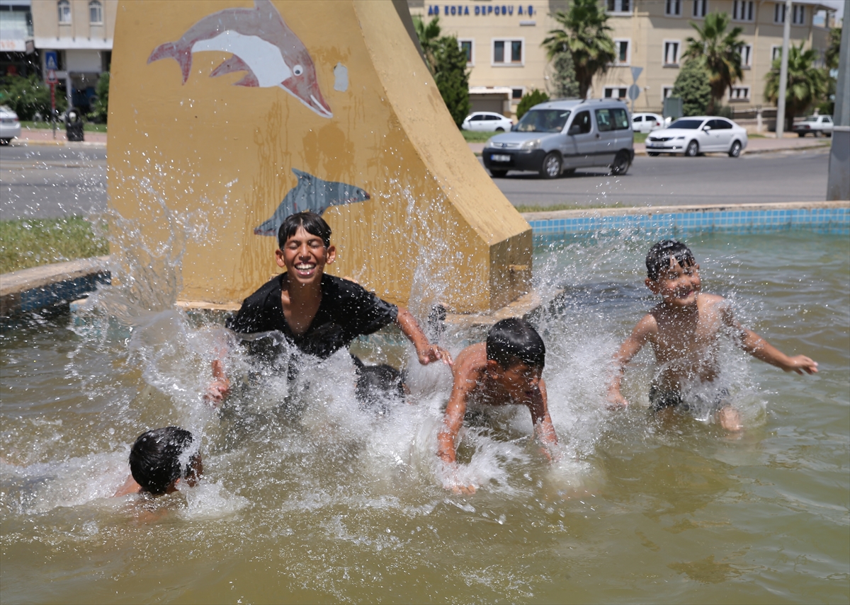 Sıcaktan bunalan bazı çocukların süs havuzlarında serinlemeye çalıştığı görüldü.