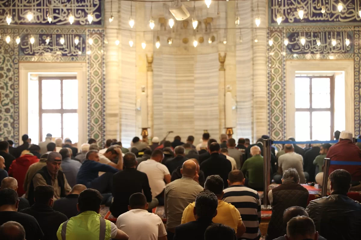 Selimiye Camisi'nde restorasyon çalışmalarının sürmesi nedeniyle cemaat ibadet için oluşturulan alanda namaz kıldı.