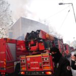 Yangında binanın yıkılması için çalışan işçiler mahsur kaldı.
