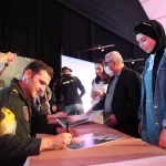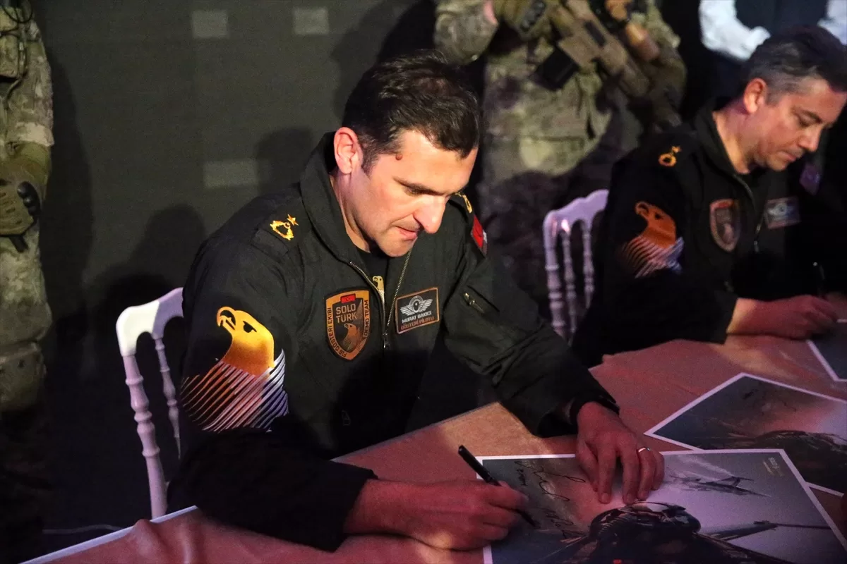 SOLOTÜRK'ün tecrübeli pilotları Binbaşı Emre Mert ve Binbaşı Murat Bakıcı, ziyaretçilerin SOLOTÜRK posterini imzaladı.