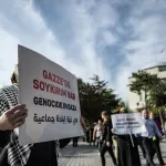 Ellerinde, "Gazze'de soykırım var" ve "Katil İsrail" yazılı Arapça, İngilizce ve Türkçe dövizler taşıyan kadınlar, oturma eylemi başlattı.