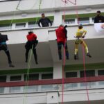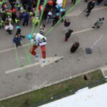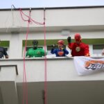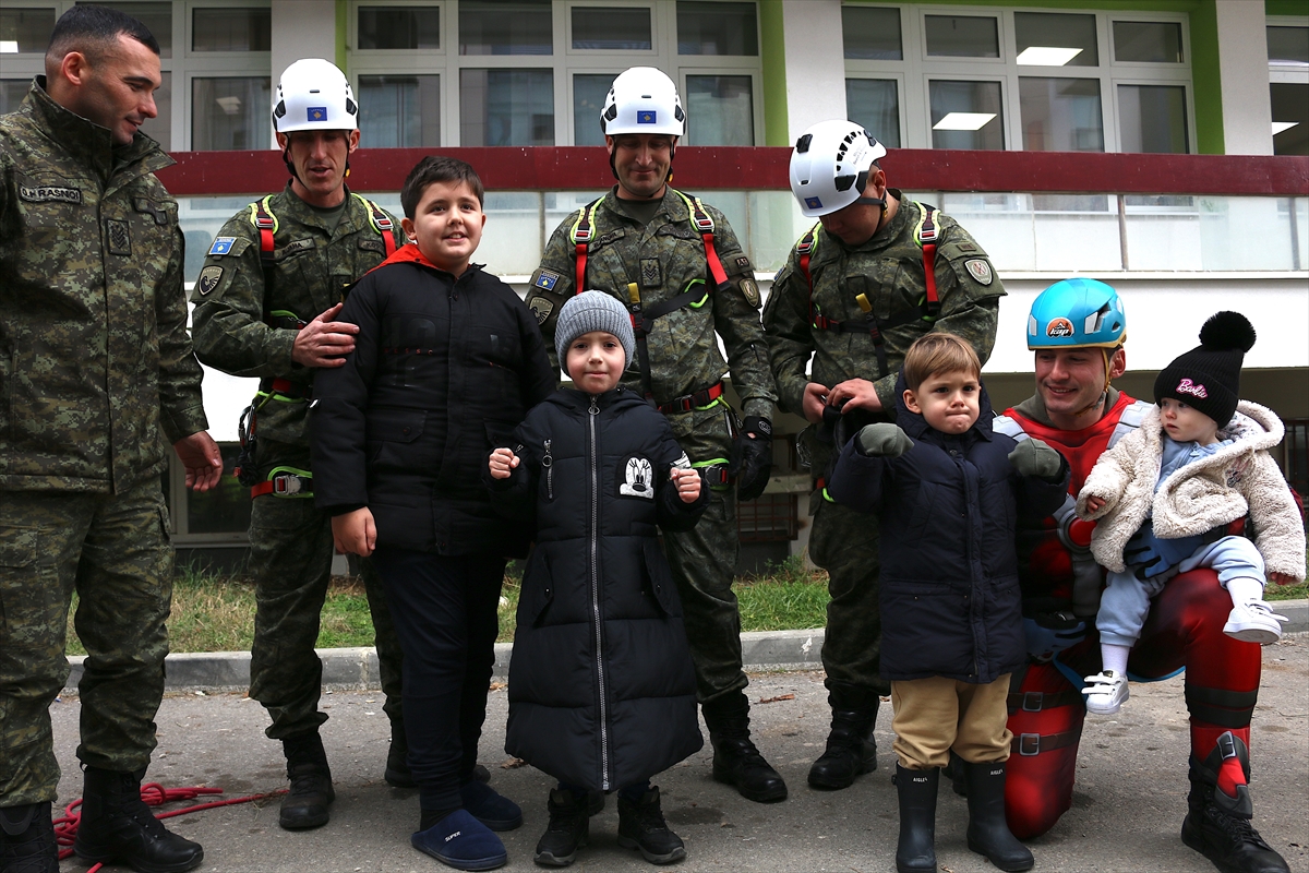Yaklaşan yılbaşı dolayısıyla QKUK'un Pediatri Kliniğinde tedavi gören çocukları sevindirmek için düzenlenen etkinlik kapsamında süper kahraman kostümleri giyen "Klubi Alpin Prishtina" topluluğu üyesi dağcılar, çatıda kurulan düzenek sayesinde binadan halatla indi.