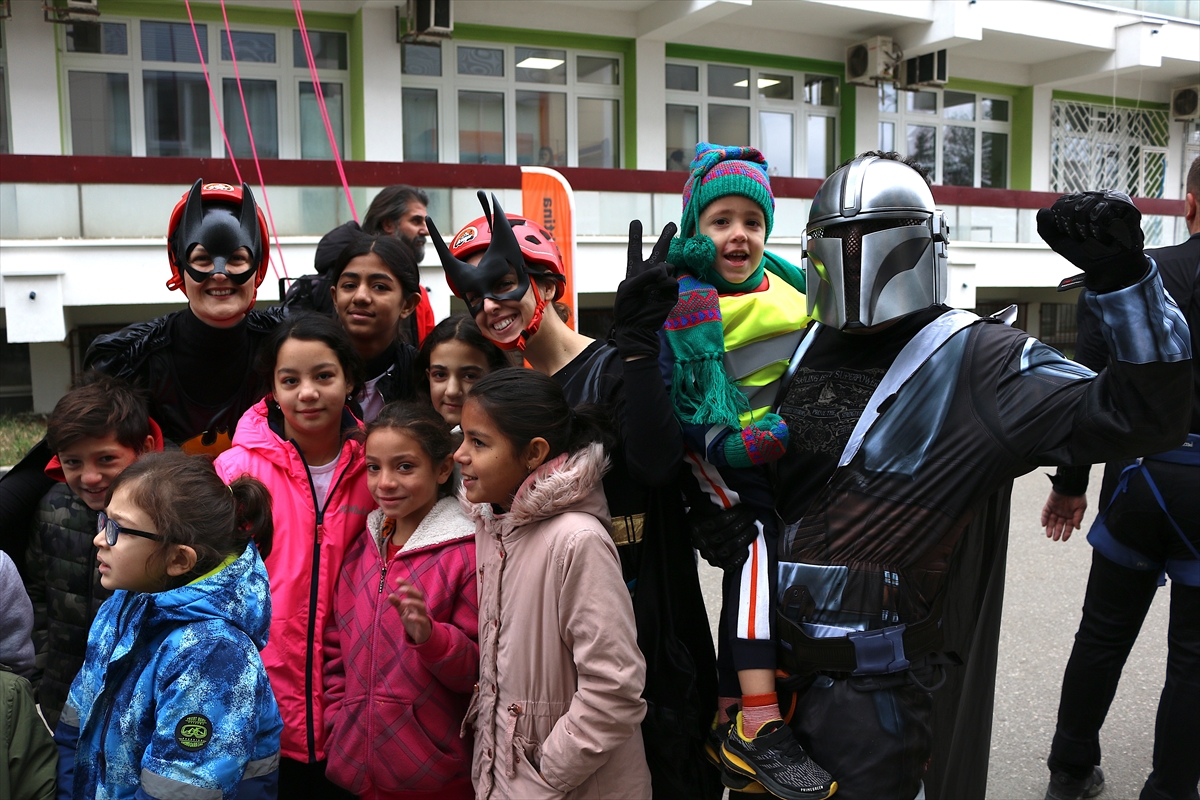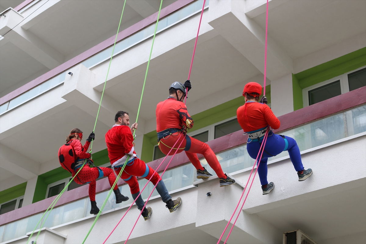 Süper kahraman kostümlü dağcılar, pencere ve balkonlardan, tedavi gören çocuklara hediyeler dağıttı.