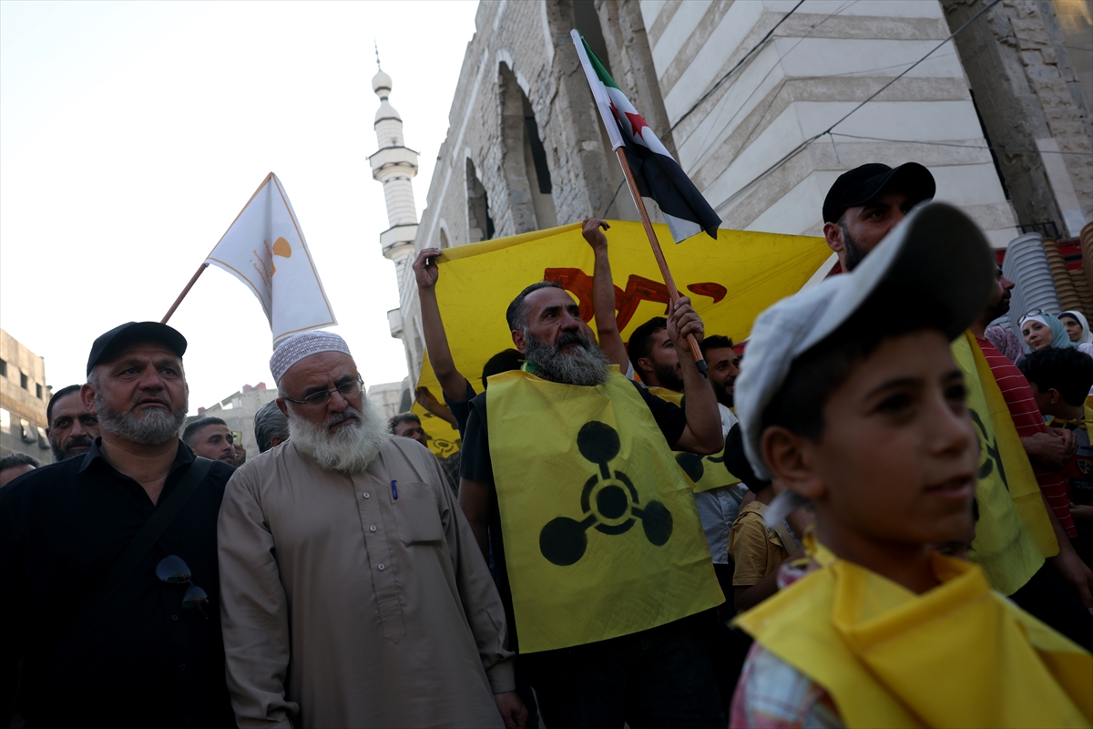Göstericiler, kimyasal saldırılarda hayatını kaybeden sivillerin fotoğraflarını taşıdı. Üzerinde "Şehitlerimizin çığlıkları kalbimizde yankılanıyor" yazılı büyük bir pankart açıldı.