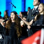 Konserde, Hacıoğulları’nın özel olarak bestelediği “23 Nisan Marşı” dört çocuk solist tarafından ilk kez seslendirildi. Marşın seslendirildiği sırada sahnede Filistin atkısı açıldı.