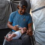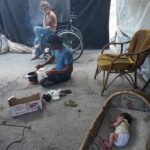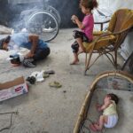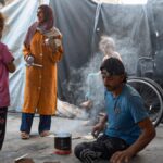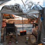 Tekerlekli sandalyeyle aşevlerine ve yardım dağıtım noktalarına gittiğini, su ve yakacak bir şeyler bulmanın bile bir işkence olduğunu söyleyen baba, "Ben bacakları olmayan bir adamım. Hasta çocuklarım var. Yemeğimiz, suyumuz yok. Çocuklarıma ne yiyecek ne de ilaç temin edebiliyorum." diyerek psikolojik olarak yaşadığı yorgunluğu dile getirdi.