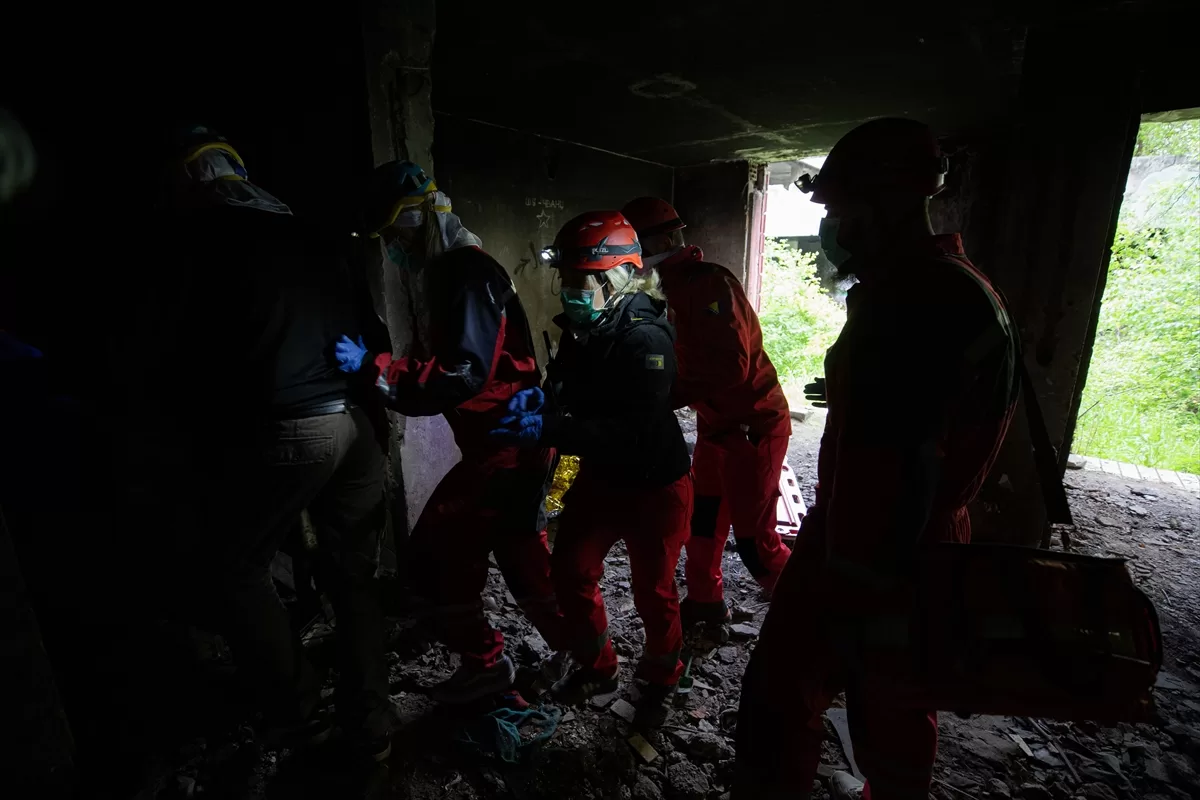 Eğitim kapsamında ekipler, bugün depremden etkilenen bir binada arama-kurtarma tatbikatı gerçekleştirdi.