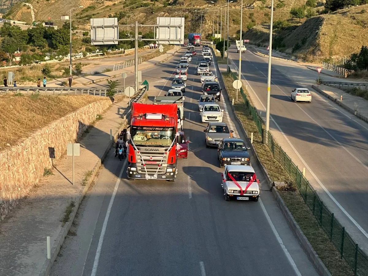 Tırın başını çektiği düğün konvoyu, kentte renkli görüntüler oluşturdu.