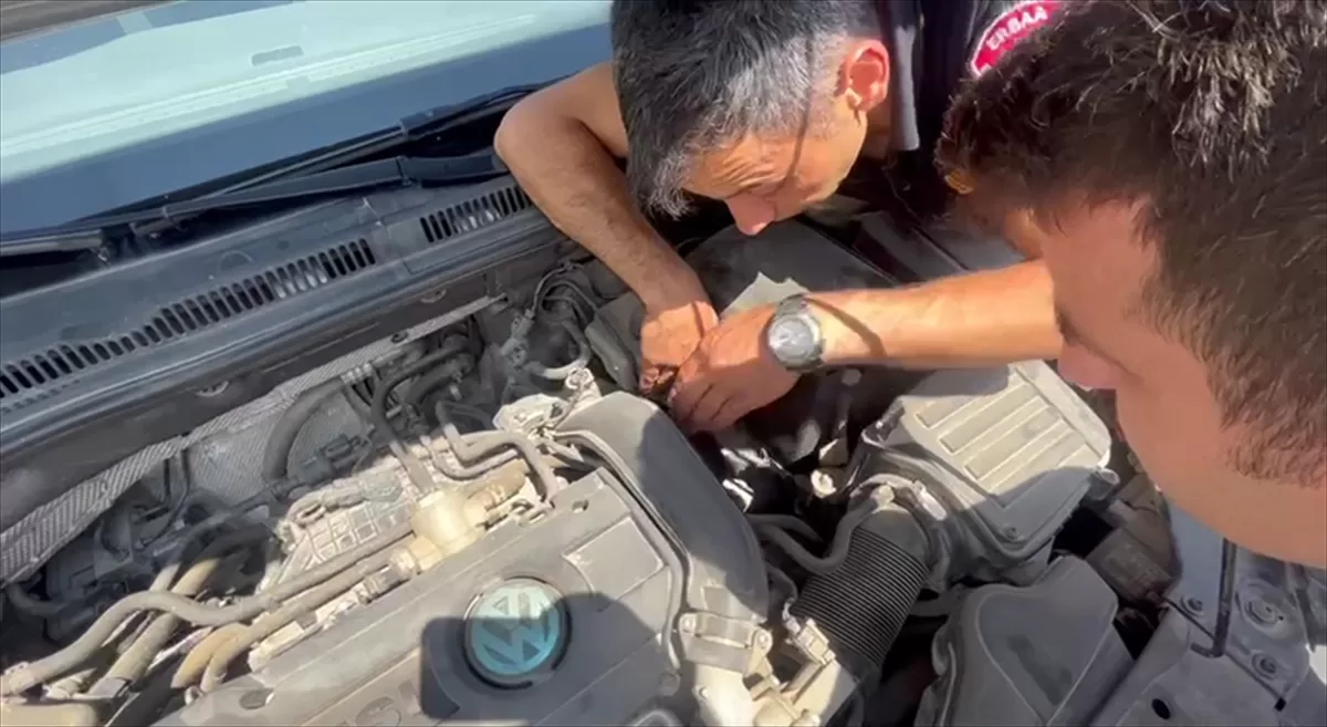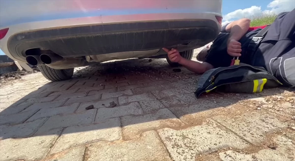 Aracın motor kısmından arkaya kaçan kedi yavrusu, ekiplerin yaklaşık 30 dakikalık çalışması sonucu bulunduğu yerden çıkarıldı.
