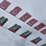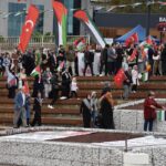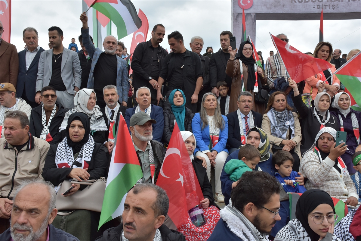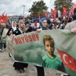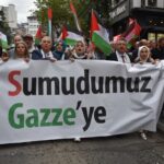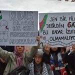 Ellerinde Türk ve Filistin bayrağı ile "Sumud'umuz Gazze'ye, Çocuklar Ölmesin, Çocuklar Büyüsün ve Sizi Bekliyorlar" yazan afişler taşıyan katılımcılar, sloganlar attı.
