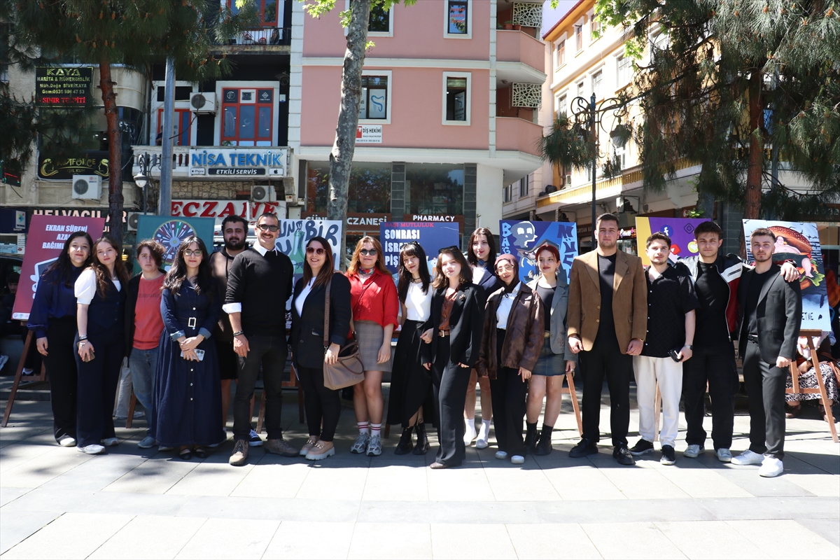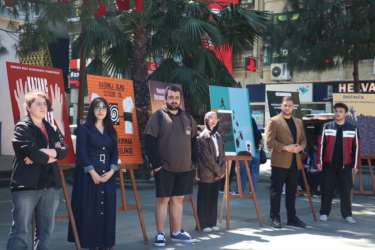 Akçaabat Atatürk Parkı'nda gerçekleştirilen sergide, Güzel Sanatlar ve Tasarım Fakültesi öğrencilerinin tütün, alkol, kumar, teknoloji ve yemek gibi bağımlılıklara dikkati çekmek amacıyla hazırladığı afişler yer aldı.