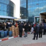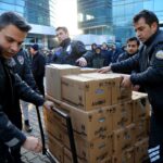 Balkan Kongre Merkezi’nde toplanan ekip, üniversite personelinin topladığı yardım malzemelerini insan zinciri oluşturarak tıra yükledi.