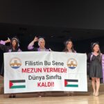 Mezuniyet töreninde öğrenciler "Filistin bu sene mezun vermedi, dünya sınıfta kaldı" pankartı açarak Filistin'e destek verdi.